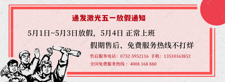假期預(yù)告:通發(fā)激光自2022年5月1日起至5月3日放假三天,期間售后服務(wù)、全國(guó)免費(fèi)服務(wù)熱線暢通,持續(xù)為大家提供有力的設(shè)備使用保障!